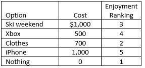 Your first inclination might be to select the iPhone because it will give you the most enjoyment. However, that doesn’t take into account the fact that it costs more than the Xbox and clothes. Clearly, though, you prefer the iPhone to the ski weekend because you get more enjoyment for the same cost.