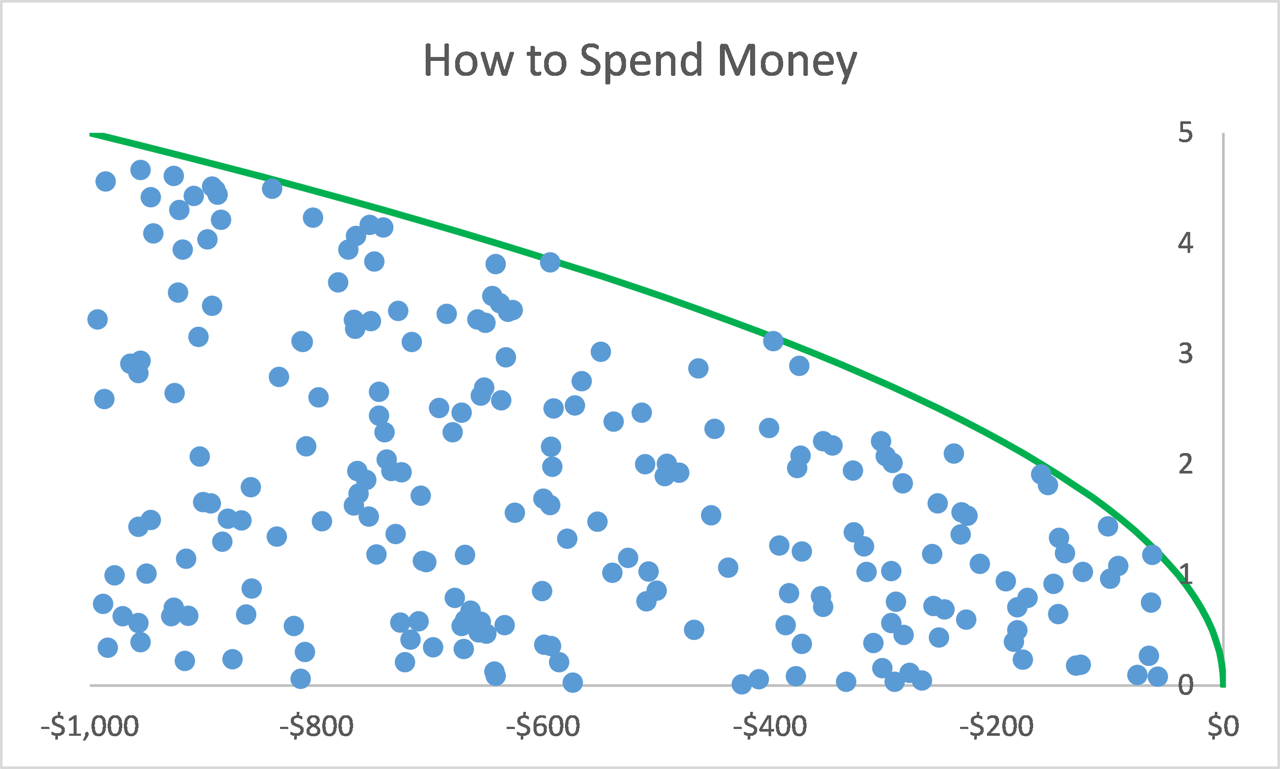 In theory, there are dozens of things that you could buy, such as is shown in the graph below.The blue dots in this graph represent the cost and your level of enjoyment of all of the options. The green line is called the “efficient frontier.” It connects all of the points the meet the following criteria:
