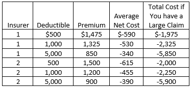 In this example, you are deciding which insurer and what deductible to select on your homeowners insurance. For this illustration, I have assumed that your house is insured for $250,000 and you have a $500,000 limit of liability. You have gotten quotes from two insurers for deductibles of $500, $1,000 and $5,000. As discussed in my post on Homeowners insurance, the deductible applies to only the property damage coverage and not liability.