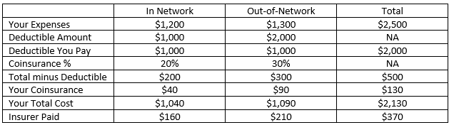 In the situation in which the in-network costs apply to your out-of-network deductible, the in-network costs are treated the same – the first $1,000 of in-network expenses fully satisfy the in-network deductible, so the remaining $200 will be covered by the health insurer subject to the coinsurance provision. The $1,000 that you paid as your in-network deductible will also apply toward your $2,000 out-of-network deductible, leaving $1,000 of out-of-network deductible. Because you have $1,300 of out-of-network expenses in this example, you would pay all of the first $1,000 of those costs and the remaining $300 will be covered by the health insurer, subject to the coinsurance provision.