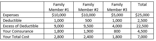You can see that the $7,000 that you would pay if three family members contribute to the $25,000 of total medical costs is more than the $5,000 you would pay if all of the expenses were for medical care for only one person.