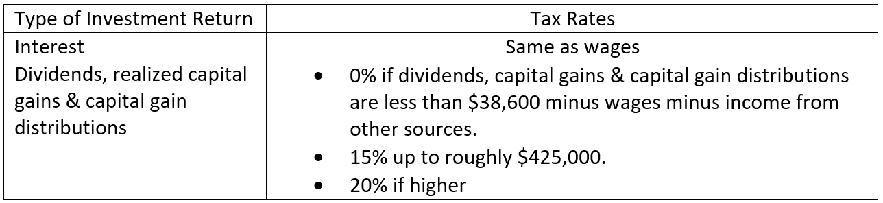 I’ll refer to accounts that aren't retirement accounts as taxable accounts. You pay taxes every year on dividends and realized capital gains in a taxable account, whereas you pay them either when you contribute to or make a withdrawal from a retirement account. The table below shows how the different types of investment returns are taxed when they are earned in a taxable account.