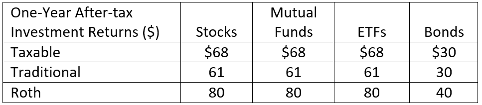 Looking down the columns, you can see the impact of the differences in tax rates by type of account for each financial instrument. You have more savings at the end of the year if you invest in a Roth account than if you invest in either of the other two accounts for each type of investment. Recall that you don't pay any taxes on returns on investments in a Roth account.