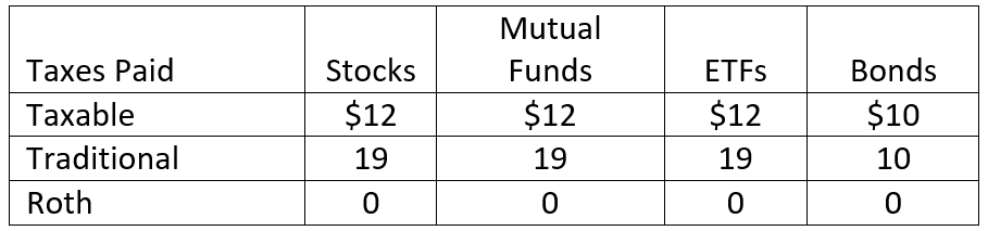 If you look across the rows, you see that you end up with the same amount of savings by owning any of stocks, mutual funds and ETFs if you put them in either of the retirement account. The mix between capital gains, capital gain distributions and dividends doesn’t impact taxes paid in a tax-sheltered account, whereas it makes a big difference in taxable accounts, as can be seen by looking in the Taxable row.In taxable accounts, ETFs provide the highest after-tax return because they don’t have any taxable transactions until you sell them. I have assumed that the stocks pay dividends every year. You have to pay taxes on the dividends before you can reinvest them, thereby reducing your overall savings as compared to an ETF. You have to pay taxes on both dividends and capital gain distributions from mutual funds before you can reinvest those proceeds, so they provide the least amount of savings of the three stock-like financial instruments in a taxable account.